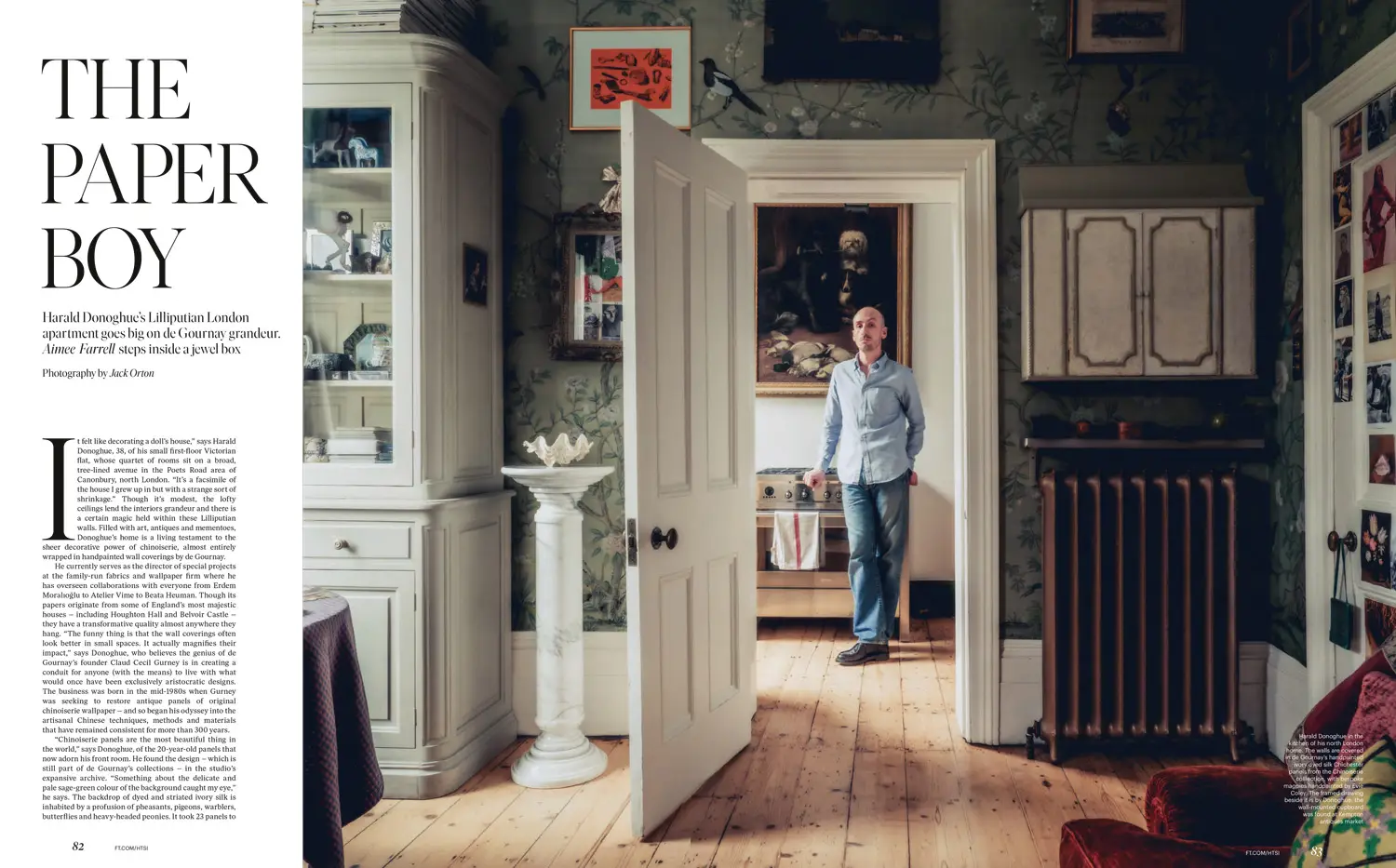 The Financial Times – How To Spend It Paper Boy: An interior feature on the London apartment of Harald Donoghue, featuring an installation of the hand-painted ‘Chichester’ Chinoiserie on dyed silk in the drawing room, and a bedroom installation of the hand-painted ‘Alba’ design on dyed silk. Written by Aimee Farrell, photography by Jack Orton.