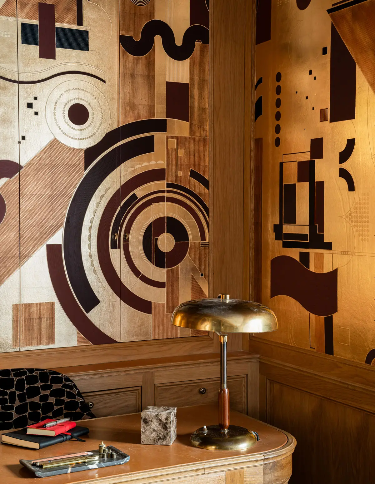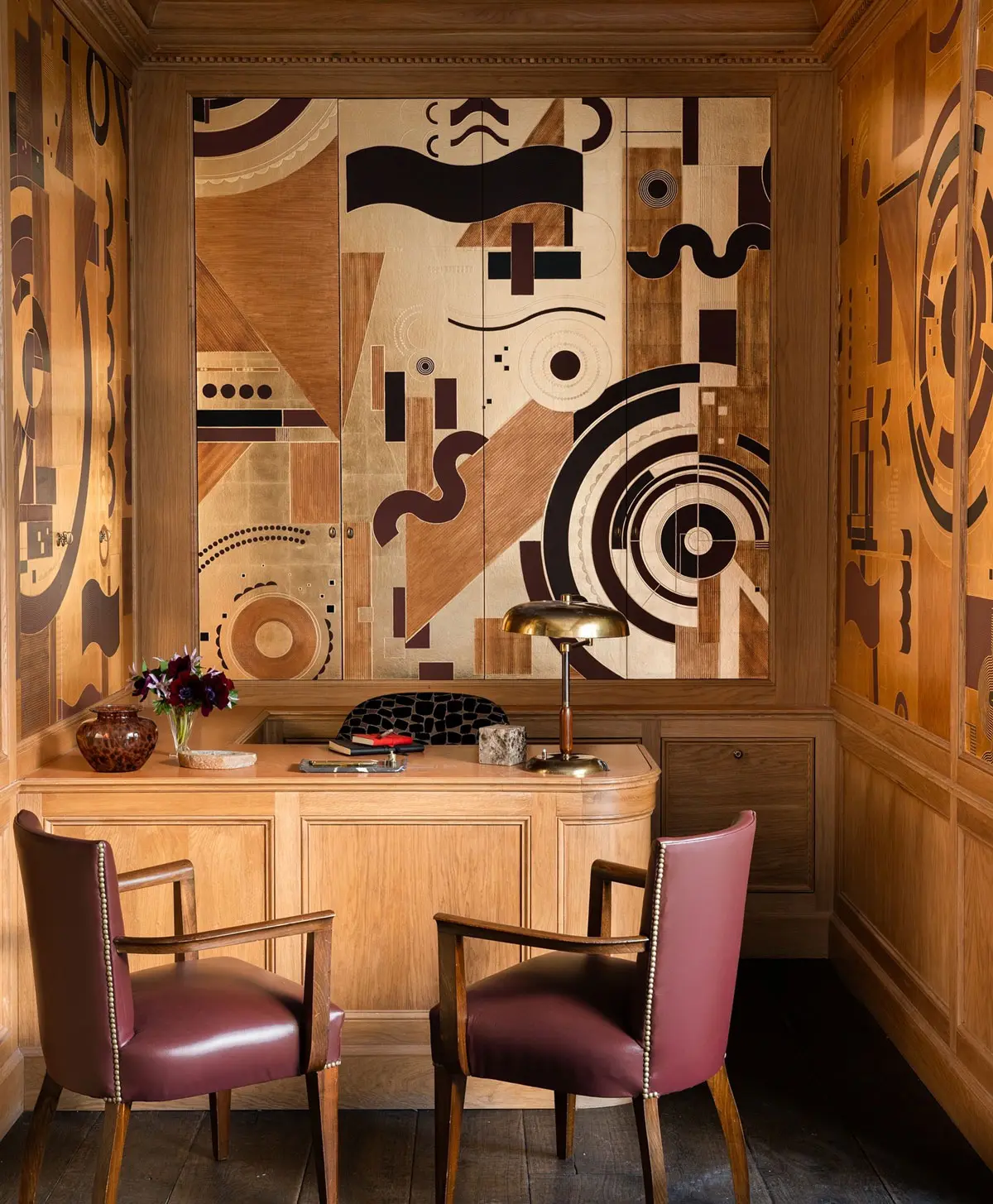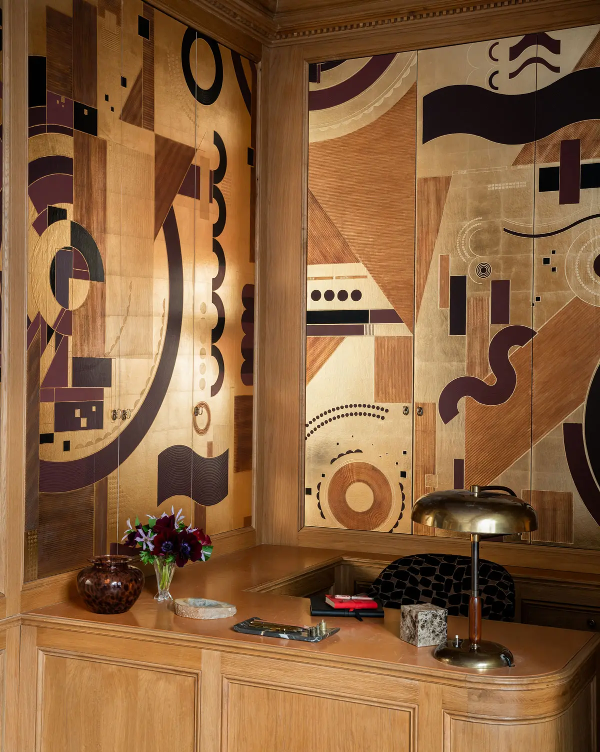 Recalling the detailed leather book bindings of the 1930s, ‘Doucet’ is an eye-catching interplay of pattern and form, suggestive of a deconstructed landscape. Named for the great French collector Jacques Doucet - one of the most important patrons of 20th-century art, who assembled two renowned libraries devoted to art, archaeology, and literature - the design is composed with the sensibility of modernist works, enlivened by dynamic variations in shape, with concentric contours elegantly punctuated by linear strokes. Rendered in bas-relief, then antiqued and polished, lustrous curves are balanced by ruled gestures, converging across a hand-painted ground in deep tones of mahogany and plum.
