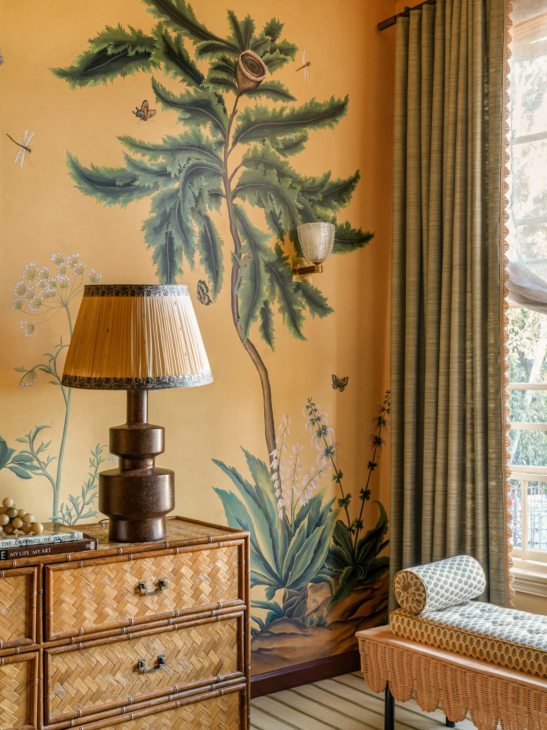 ‘Hortus Medicus’ references a set of eight 17th-century oil on canvas paintings acquired by Bunny Mellon in the 1970s at the suggestion of her friend Hubert de Givenchy. The artworks, depicting striking renditions of mandrake, Carline thistle, common aloe, and other medicinal plants, originally hung in an apothecary in the Loire Valley that was saved from destruction during the French Revolution. Portrayed at a monumental, larger- than-life scale with hovering insects and butterflies to animate the scene, many of the plants have exposed roots and bulbs, likely the artist’s way of hinting at their medicinal applications. To mimic the thick impasto look of the original canvases, this design is hand-painted using layers of matte and opaque paints and then lightly sanded and distressed to further enhance the darkened, timeworn feel.