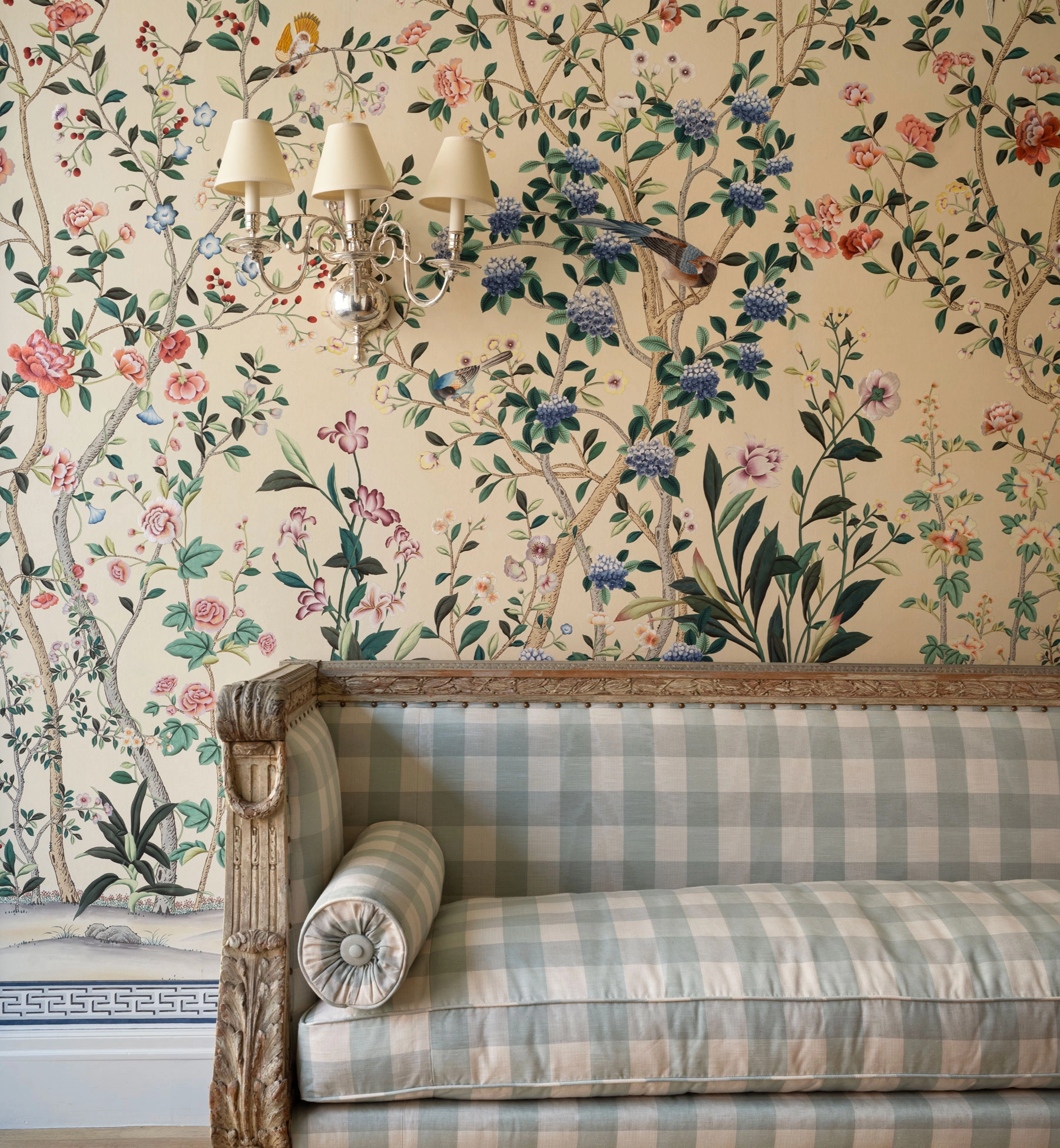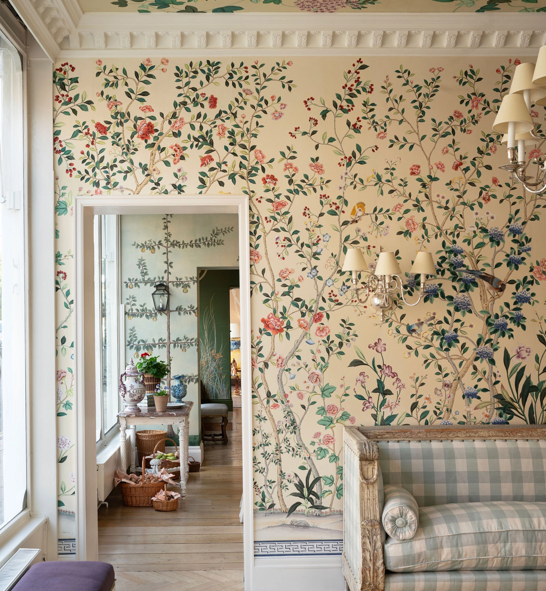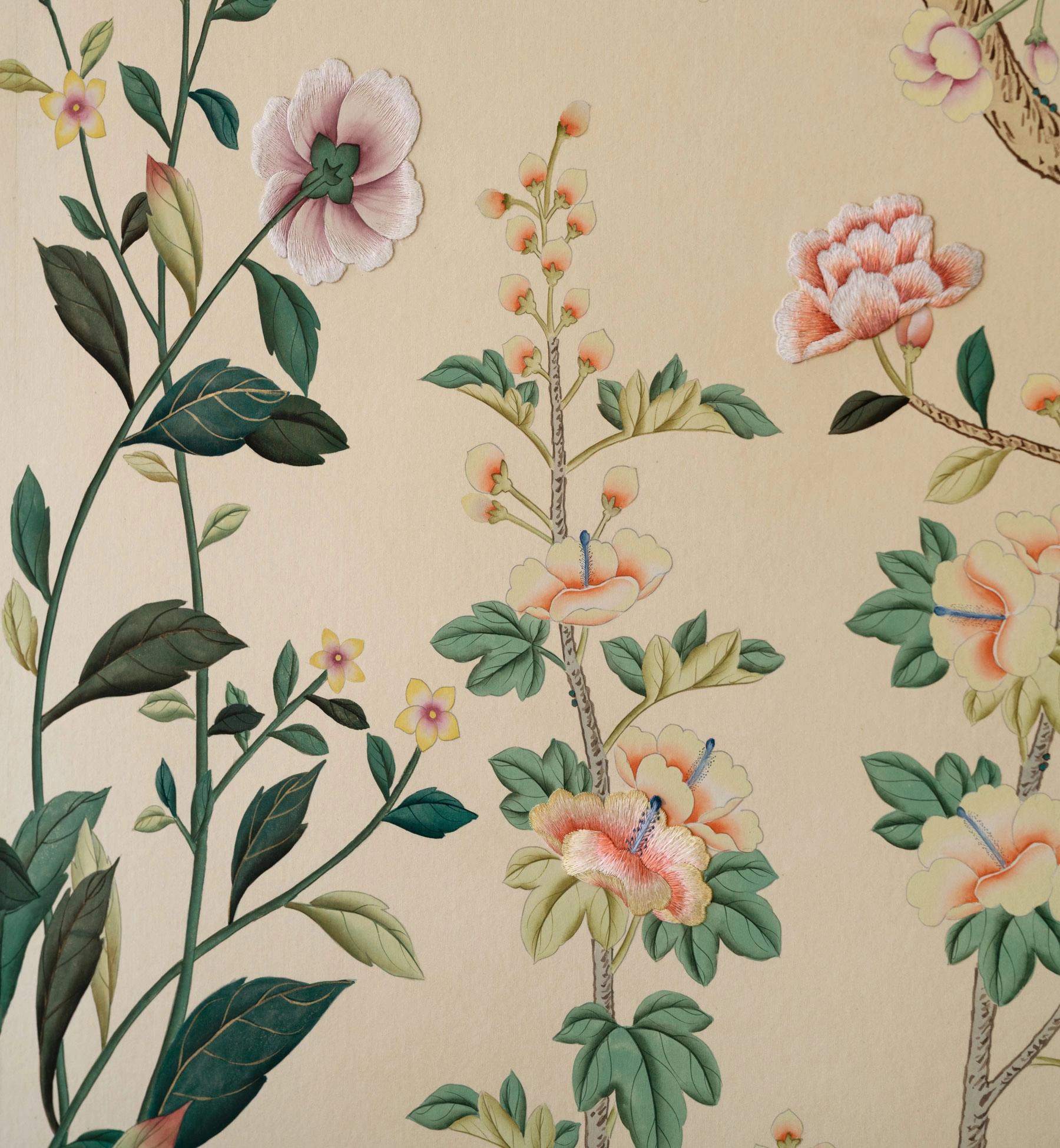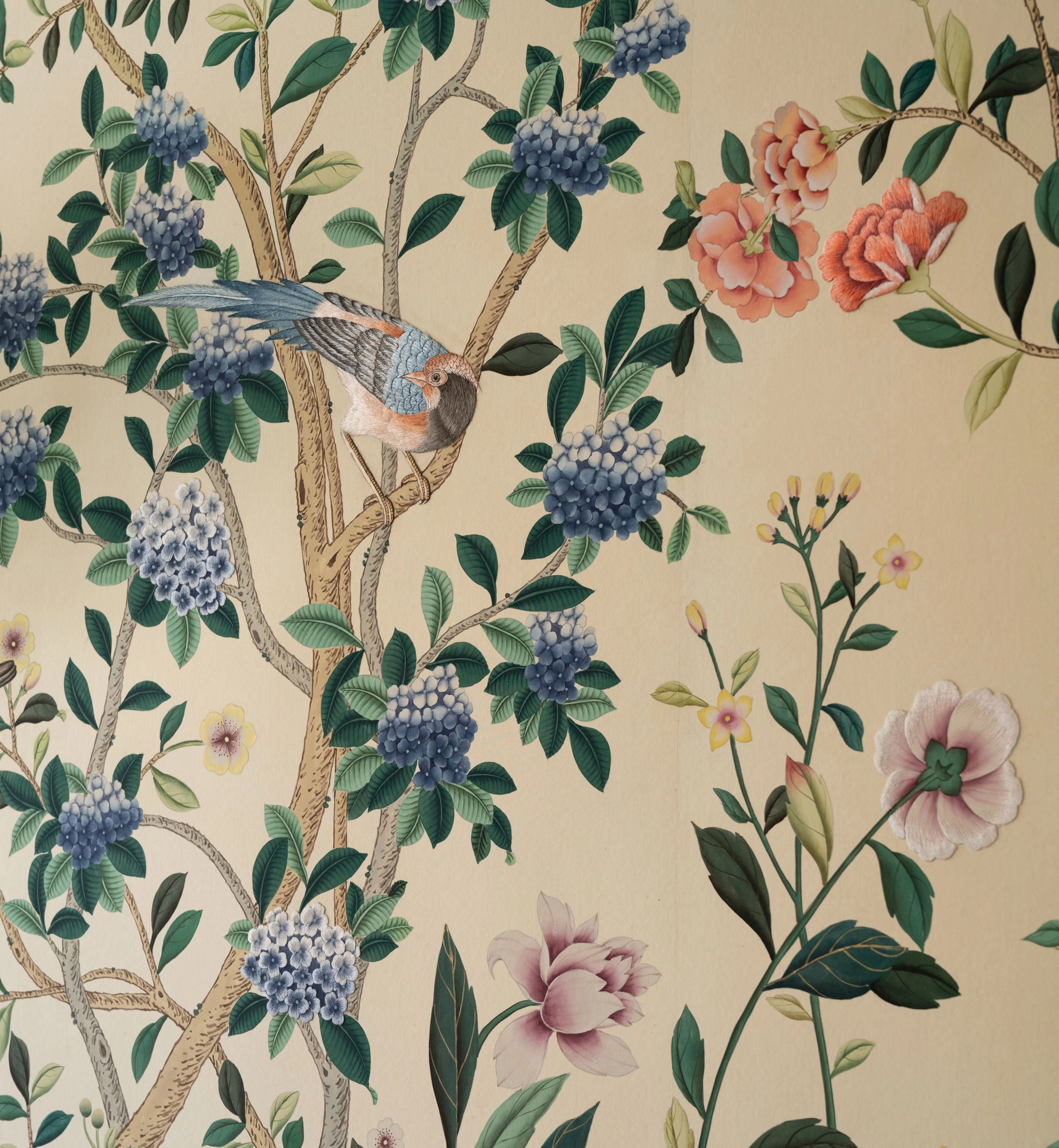 Created in collaboration with fashion designer Erdem Moralioglu, our Erdem design is a riotous depiction of nature in full bloom, a springtime vision of flora and birds: presenting the medium in a kaleidoscopic rendition of saturated tones. Hydrangea, Hollyhock, Irises, Chrysanthemum, and Morning Glory jostle amidst a verdant lattice of branches, with Sparrows, Warblers, Pheasant and Egrets interspersed throughout. Honoring specific instruction from Erdem that the birds appear especially full of life, they appear darting through the foliage, taking flight and energetically craning their necks.