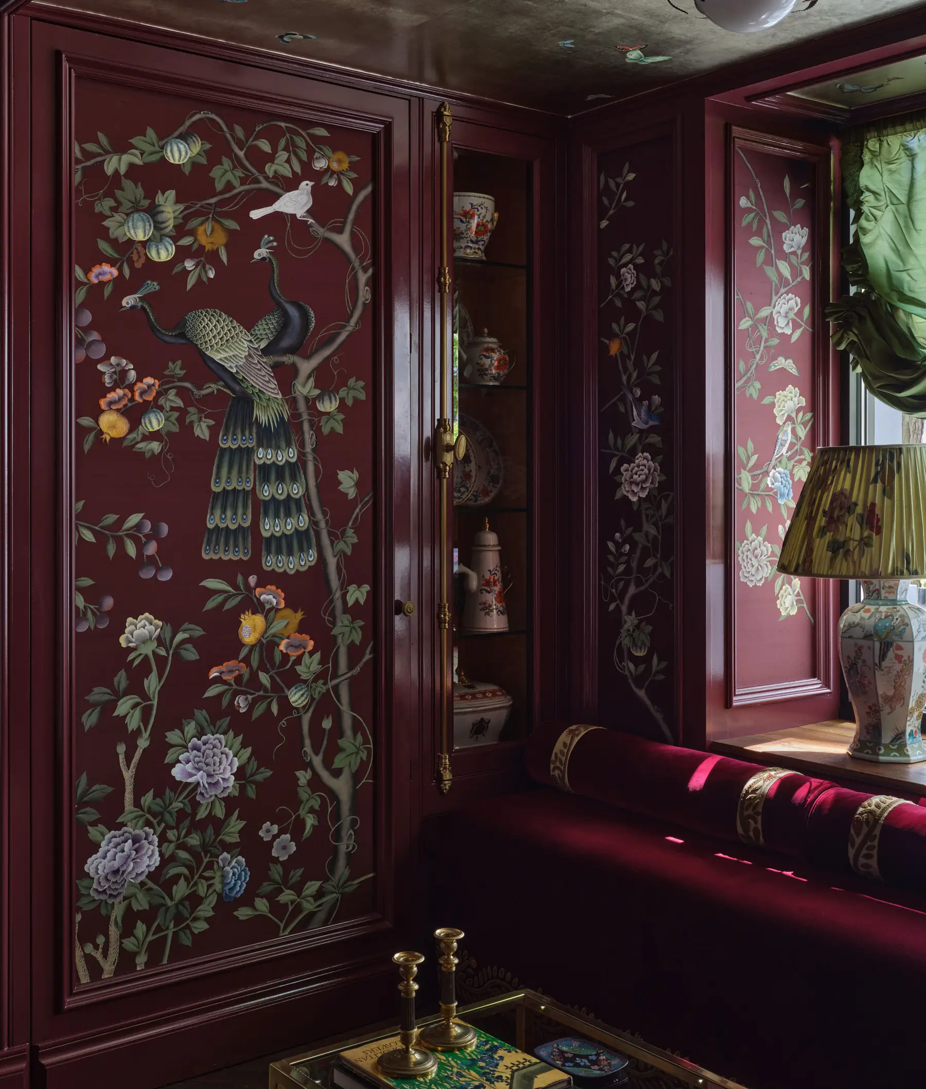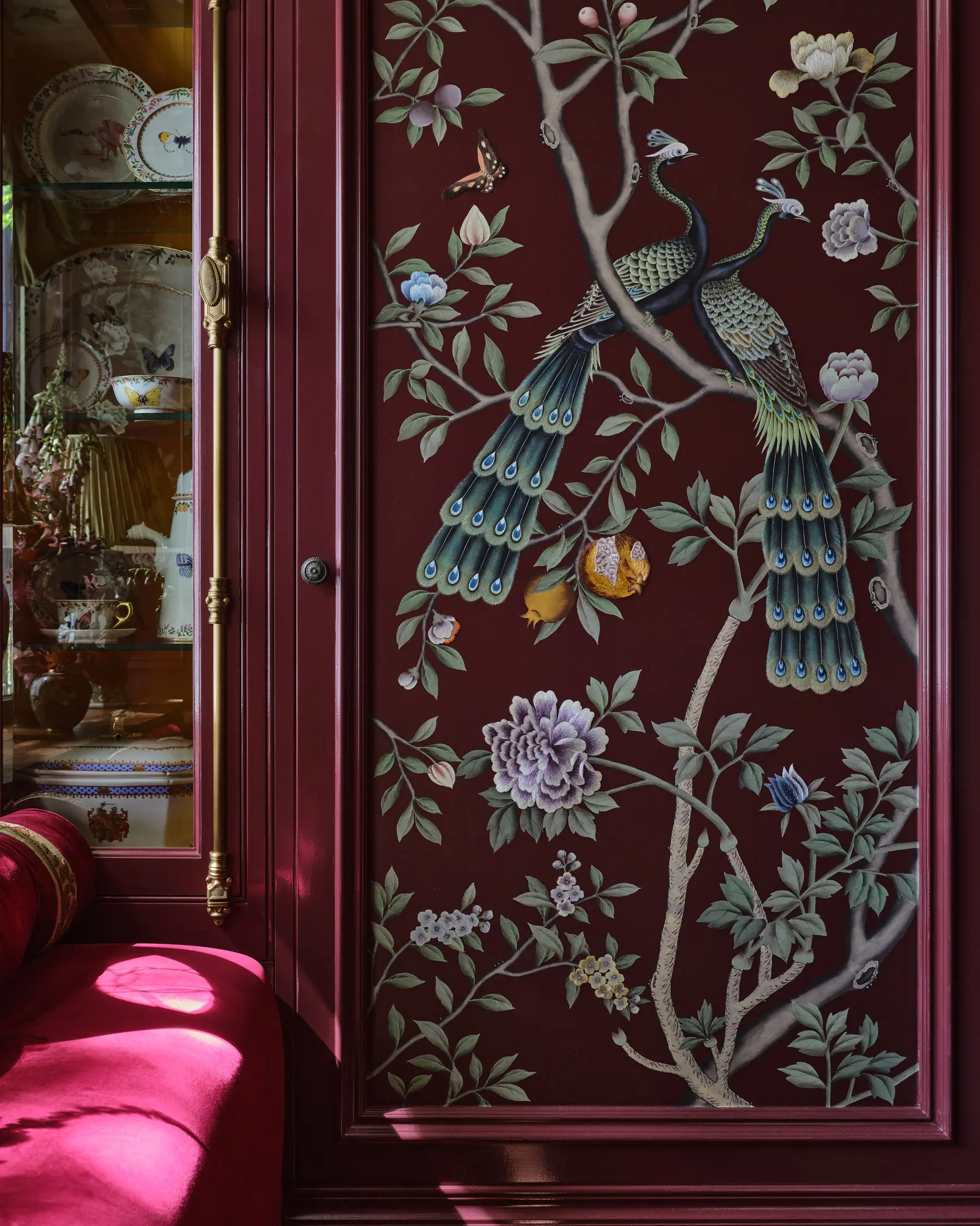 One of our most visually dense Chinoiserie designs, St. Laurent portrays an oriental garden in riotous bloom. Inspired by antique panels belonging to Yves Saint Laurent and Pierre Bergé, de Gournay’s interpretation maintains the full drama and grand scale of the original, distinct for their finely worked renderings of elaborate peacocks and doves amidst flowering bushes such as Peony, Prunus, Camelia, and Chrysanthemum, flowers the era would have considered highly exotic.