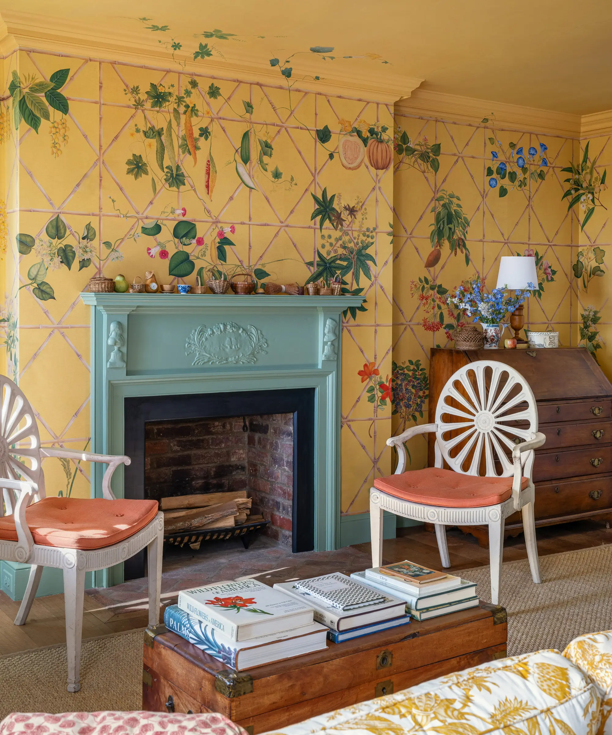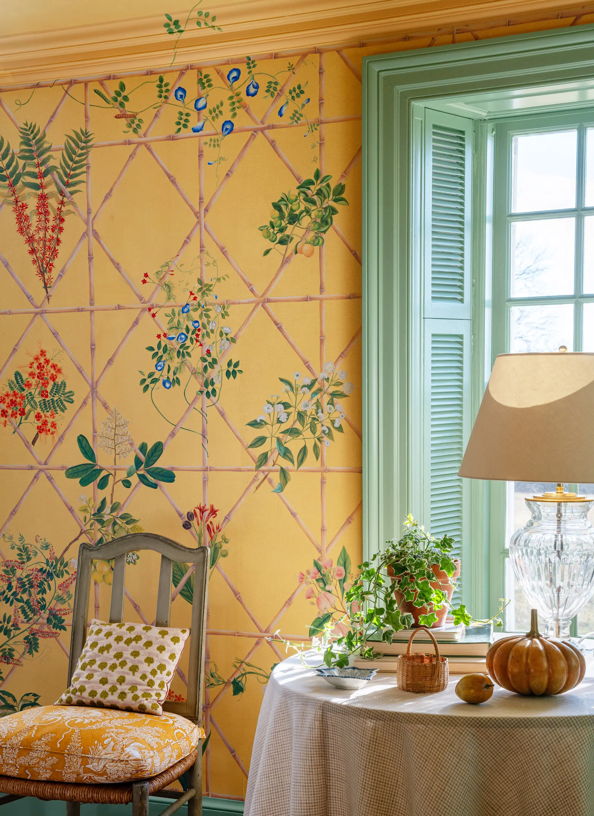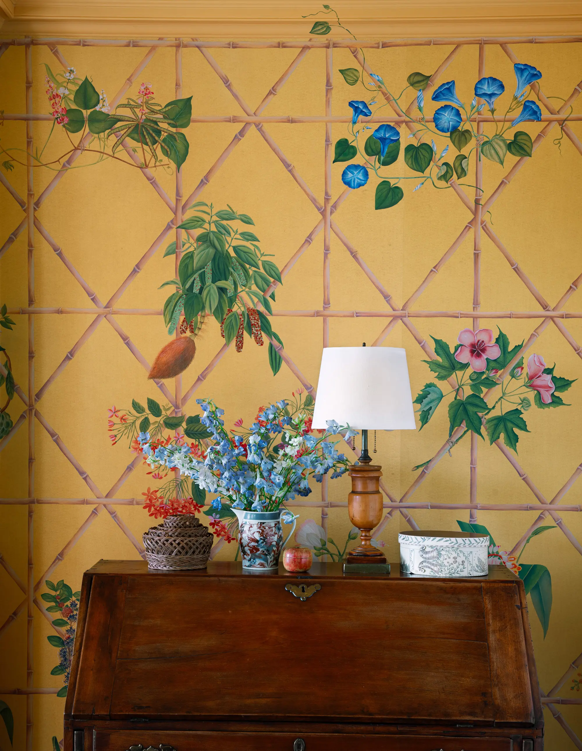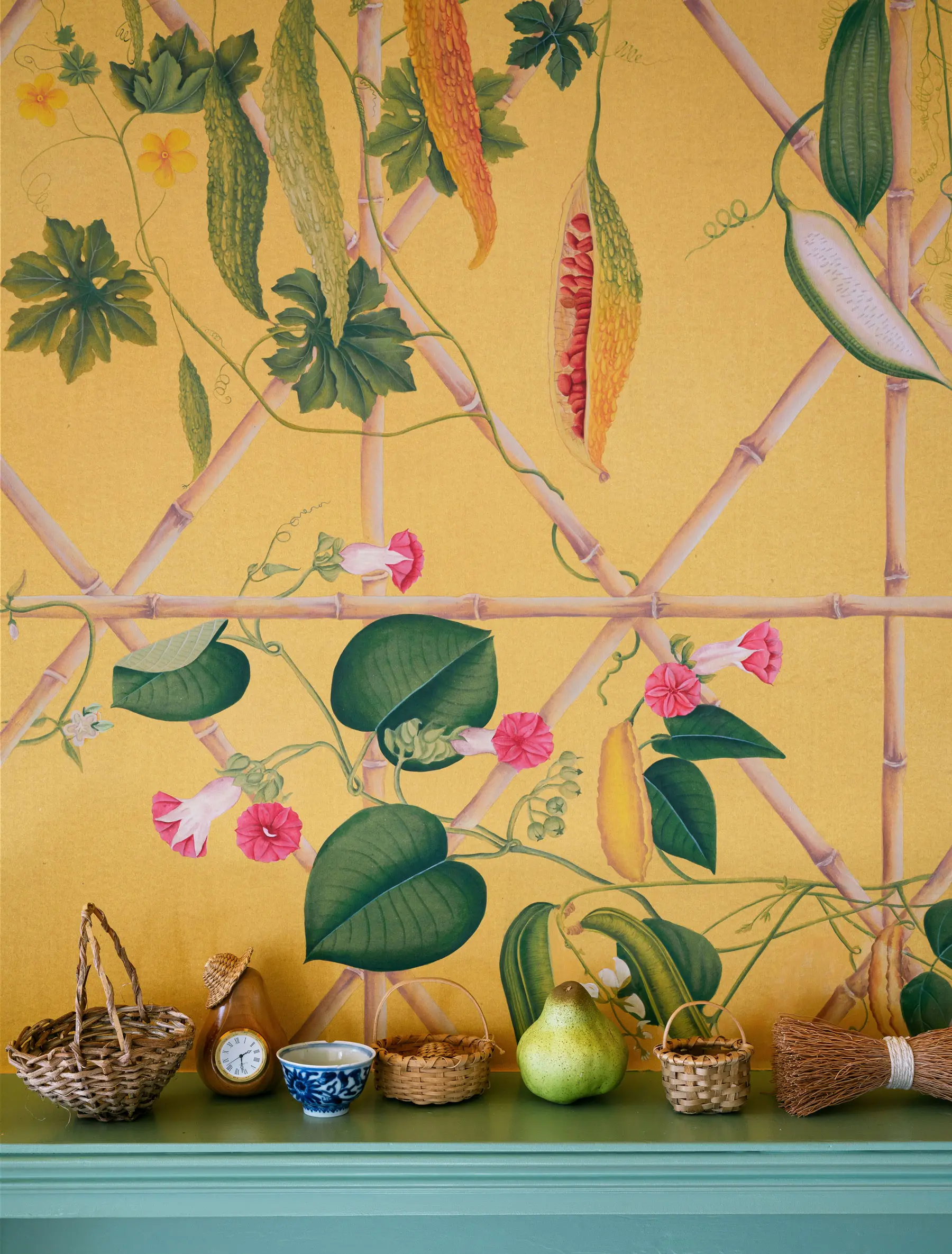 Twisting and sprawling over a bamboo trellis, the creeping vines, leafy gourds, and vividly-coloured flowers of India in ‘Miss Gough’ recall the watercolour drawings of a young English woman in Madras in the 1840s. The album, which Bunny Mellon purchased in 1963 and is now housed within the Oak Spring Garden Library, includes naive depictions of a variety of Indian plants found within the Gough family’s garden, which we have interpreted in vibrant contrast against a yellow ochre painted Xuan paper ground. The trellis design draws from the trompe l’œil bamboo seen within the Oak Spring Formal Greenhouse, providing an architectural framework to the wild and dynamic plant life.