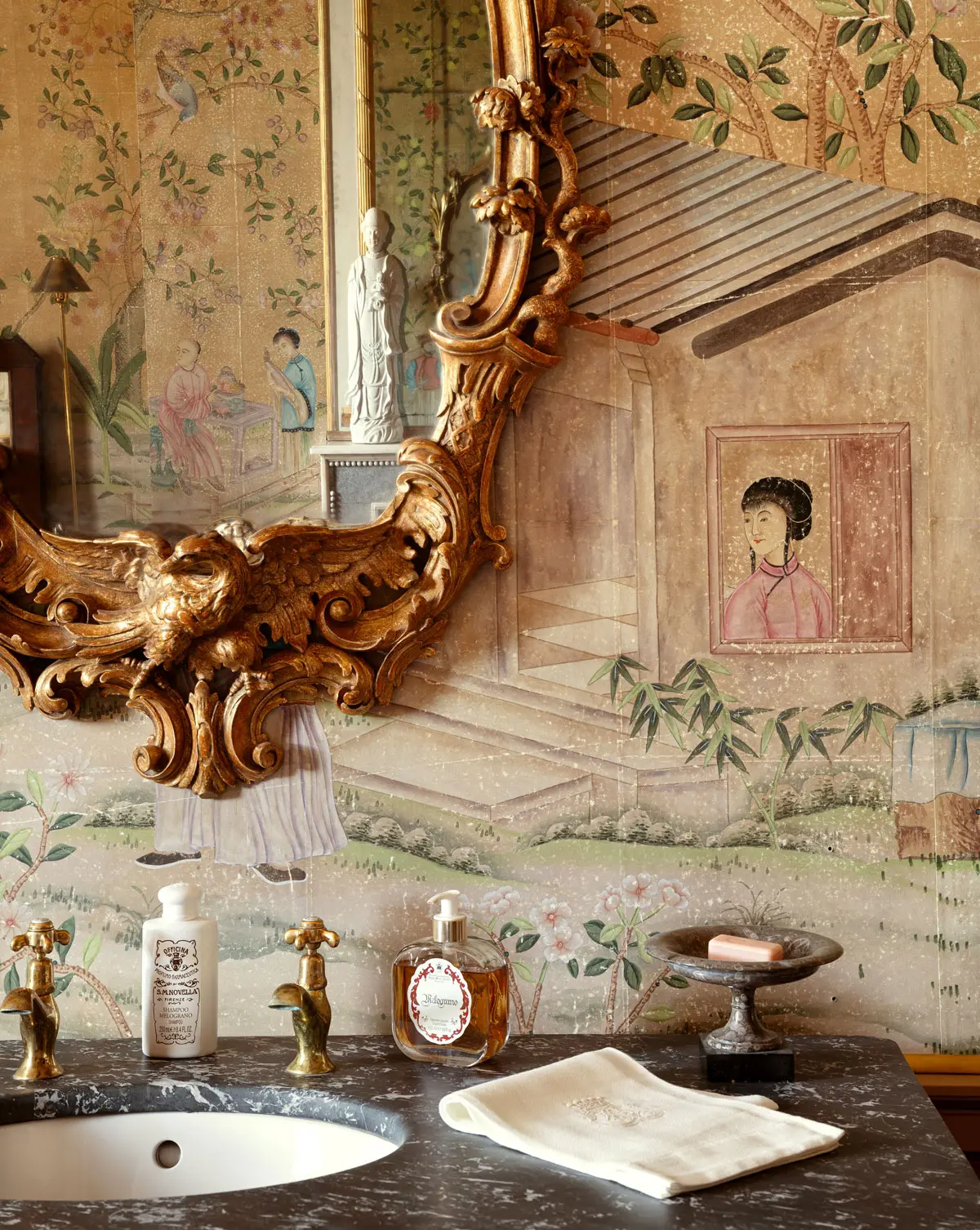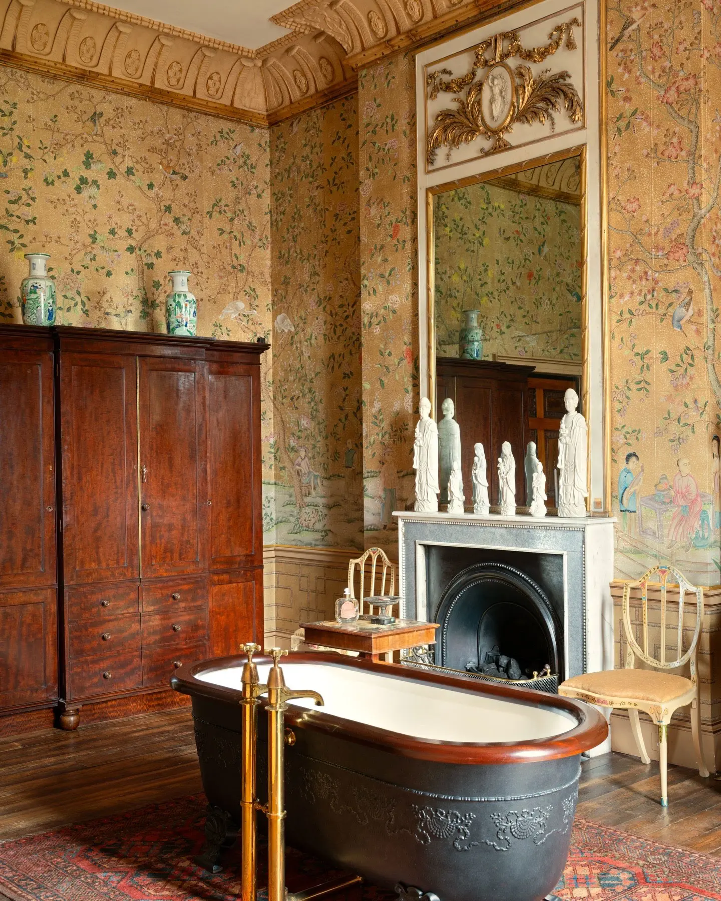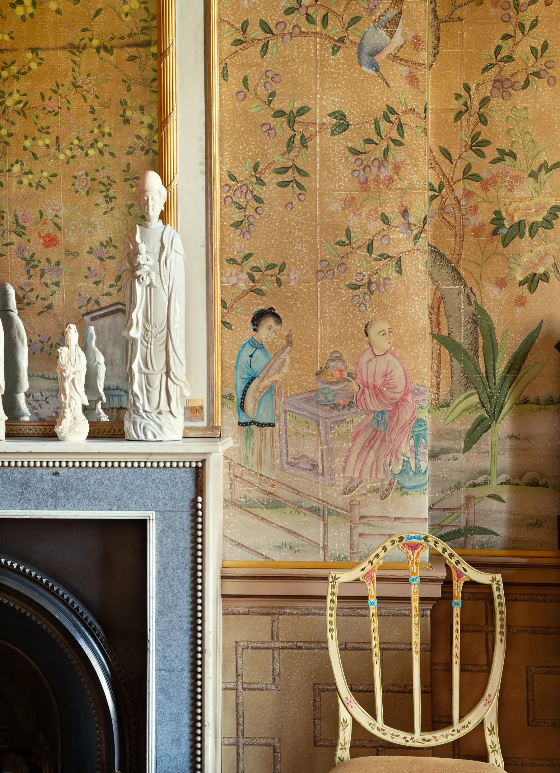 While many of our Chinoiserie designs have been adjusted for contemporary interiors, Abbotsford is an unmodified reproduction of some of the most impressive antique panels we have encountered. A densely packed design featuring figures, animals, and exotic birds amidst a variety of plants that would be found in a fine oriental garden. The original model is a rare set of panels attributed to the late Qianlong period and is named after a very similar surviving set that hangs in the drawing-room at Abbotsford, Sir Walter Scott's home in Scotland.